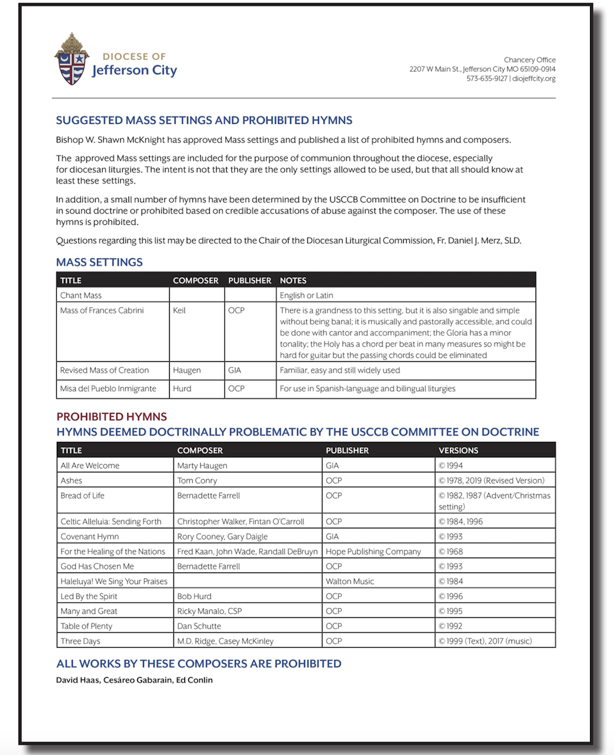 Back to Jefferson City. This is the list of prohibited hymns and composers from the diocesan website: