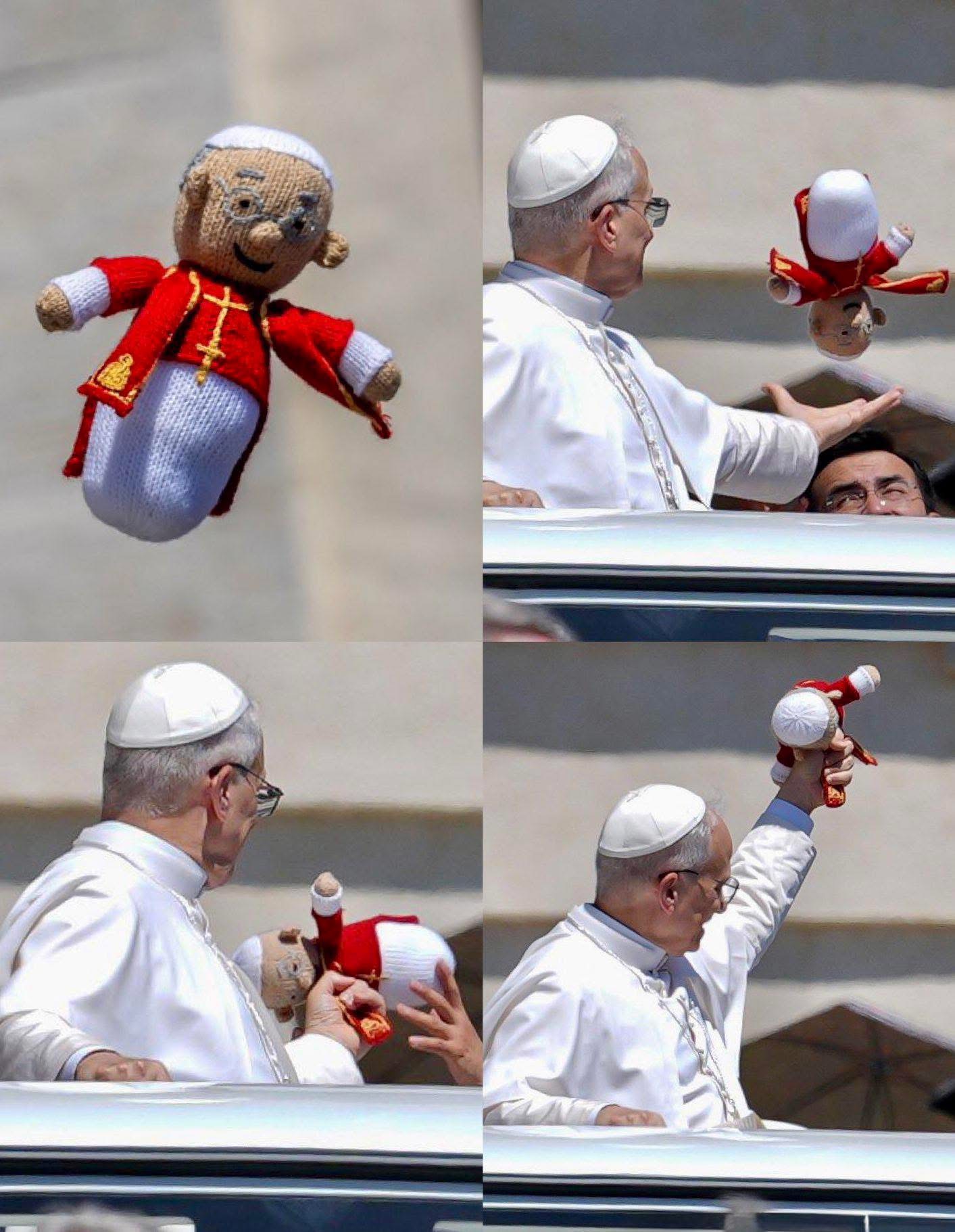 Wednesday, somebody from the crowd tossed Leo XIV a little knitted pope doll.