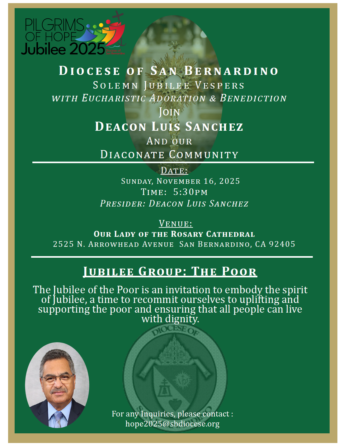 Dear Diaconate Community,In the Holy Jubilee Year that remains, Pope Leo ask us to pray for the community of the Poor in our world. Please join us on Sunday, November 16 at Our Lady of the Rosary Cathedral. Please see the attached flyer for details.Let us live out our Charism of Charity and pray on Sunday, November 16. Deacon Luis will preside the Solemn Vespers. You and your spouses will join the Assembly.Estimada Comunidad Diaconal,En este Año del Gran Jubileo que nos queda, el Papá Leon nos pide a rezar por la comunidad de los Pobres en el mundo. Por favor de acompañarnos el domingo, 16 de noviembre en la Catedral de Nstra Sra del Rosario. Por favor de ver el volante adjunto para más detalles.Vivamos nuestro Carisma de Caridad y rezar el domingo, 16 de noviembre. El Diácono Luis presidirá la Vísperas Solemnes. Usted y su esposa acompañarán la Asamblea.May Our Lord bless your week/Que el Señor bendiga su semana.Msgr Lopez