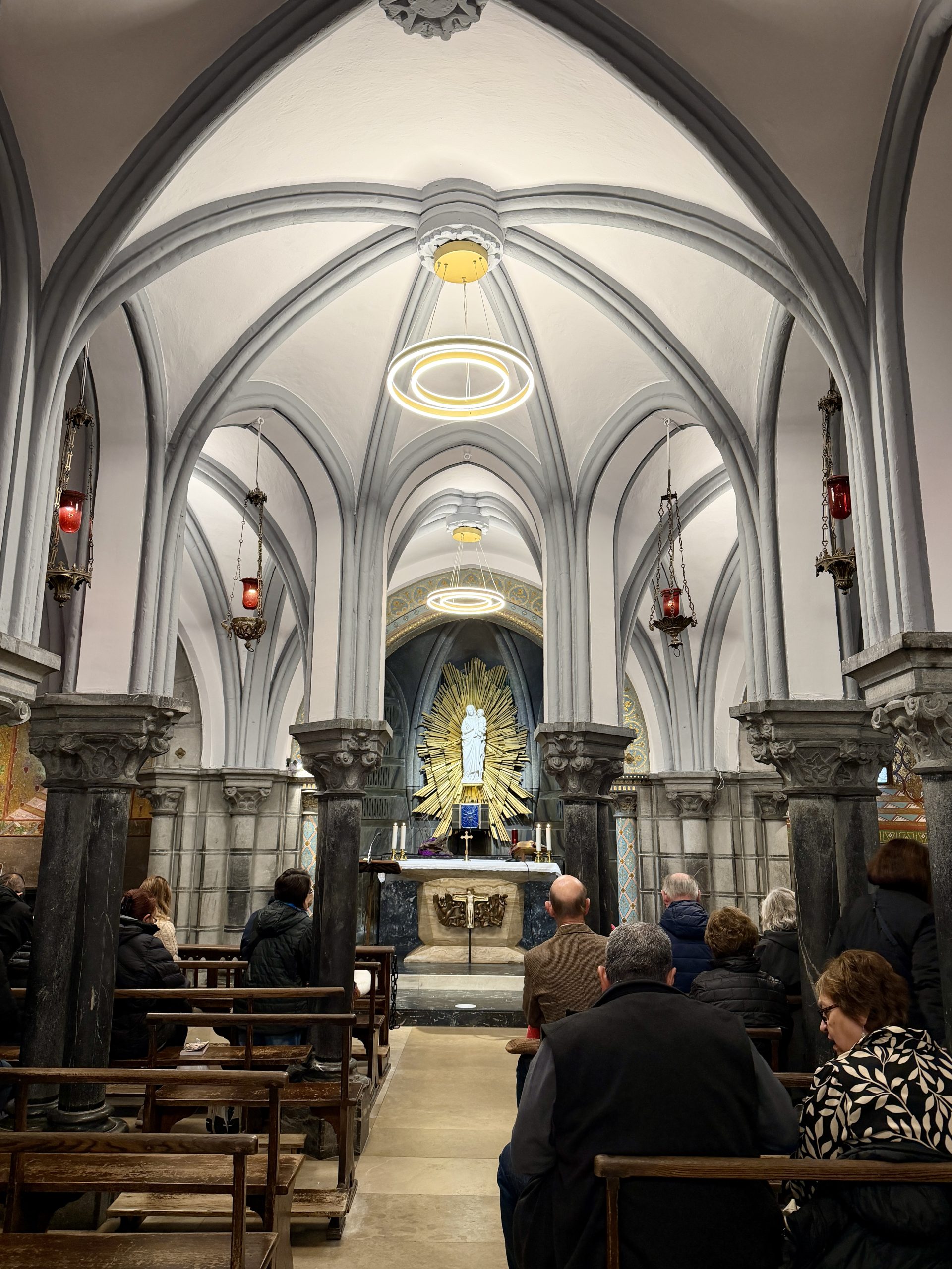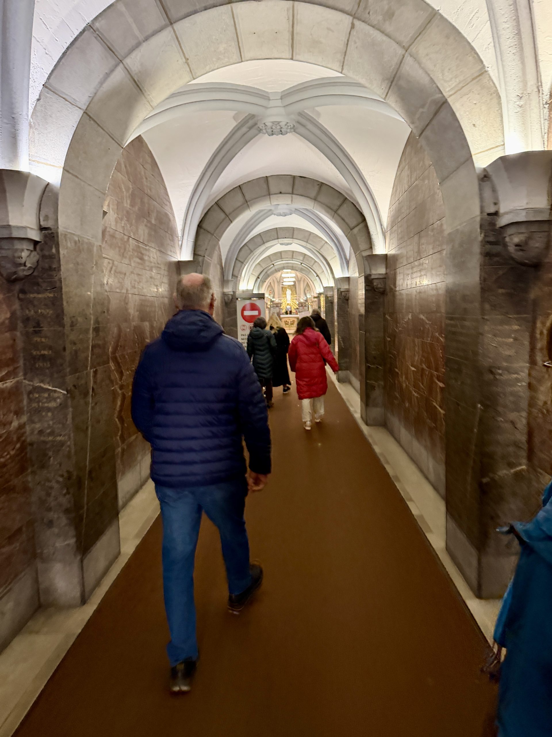 We began with Mass in the lower level of the Lourdes basilica, reached by walking down a long corridor under the main church, which takes you to a chapel directly over the grotto.
