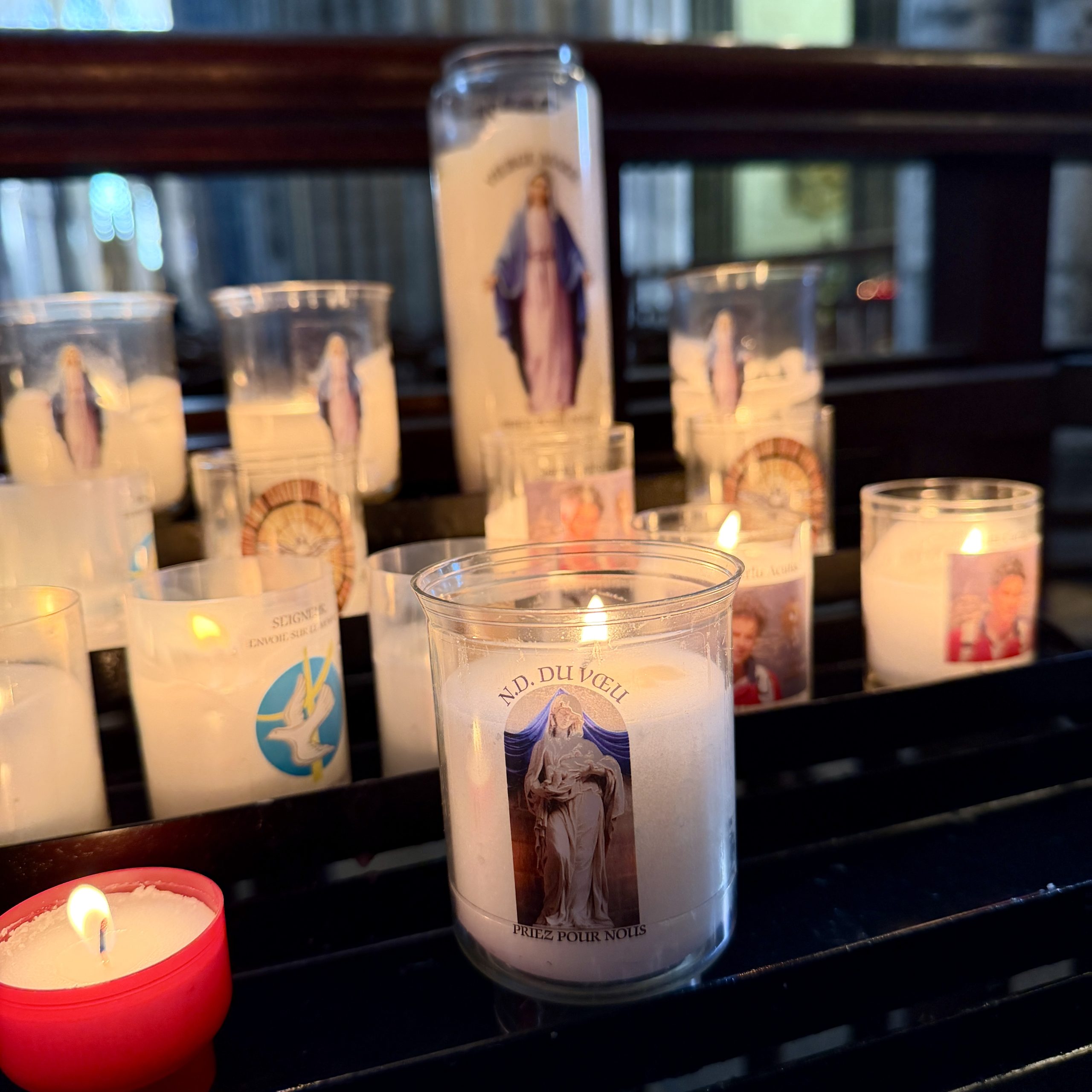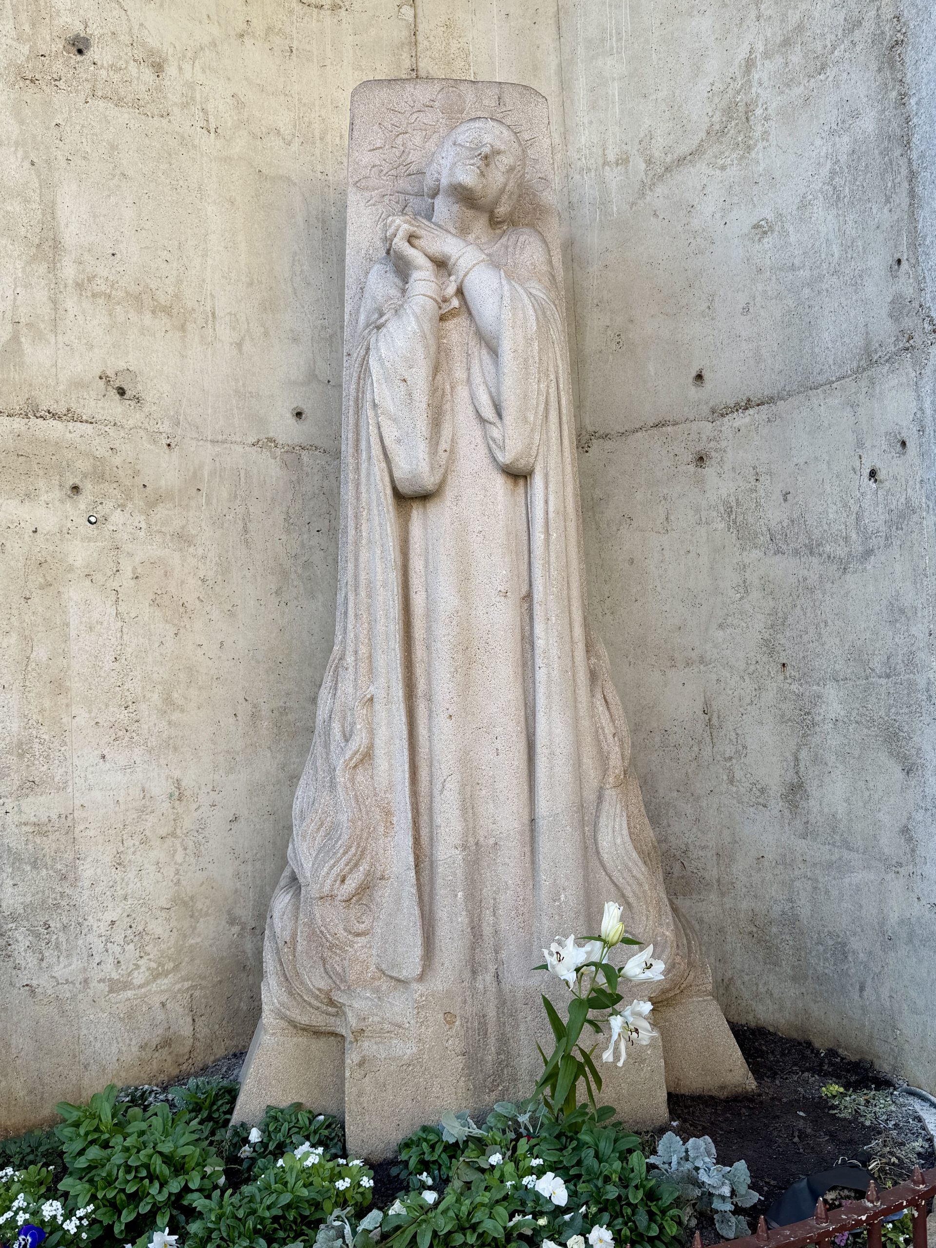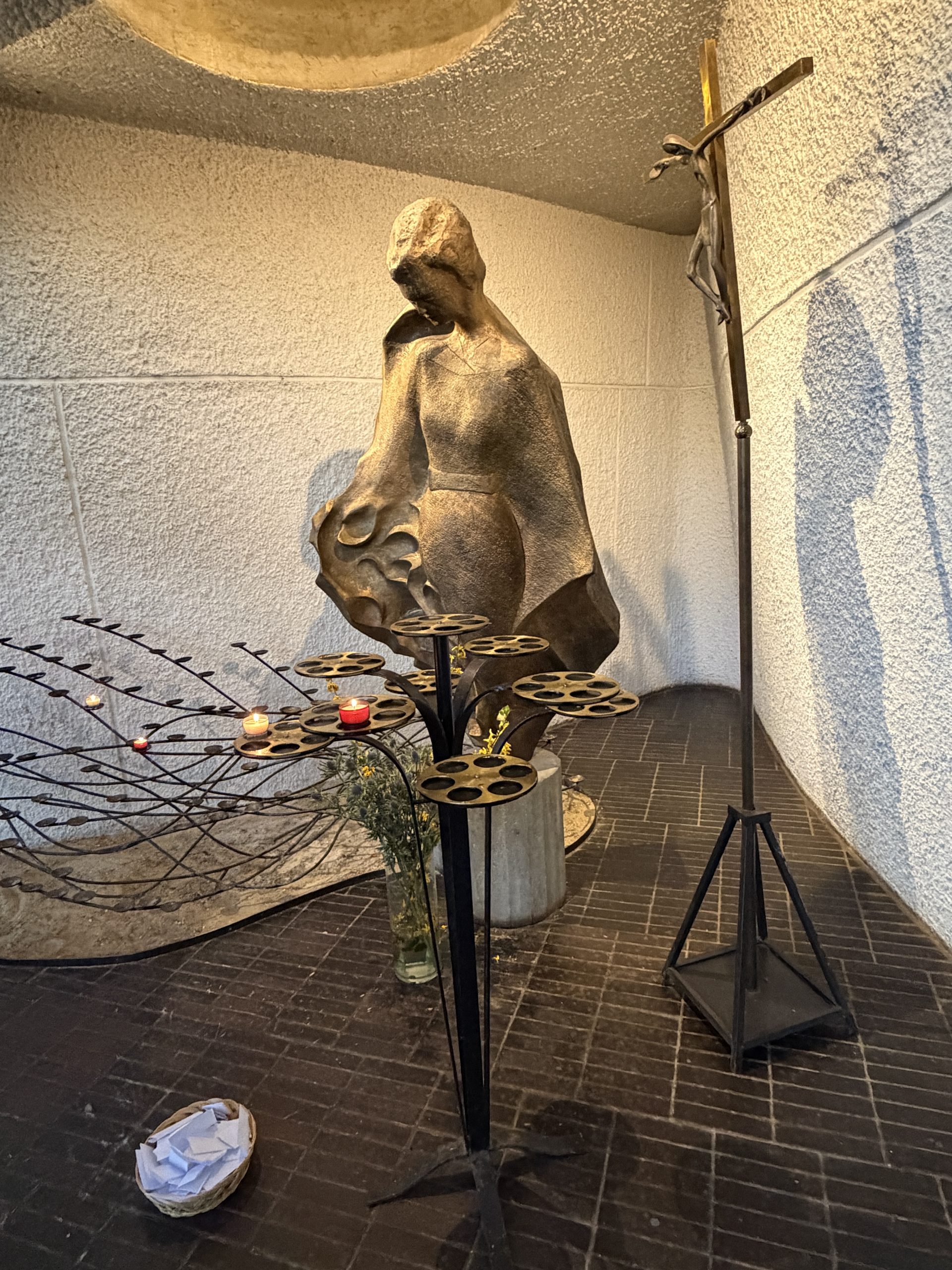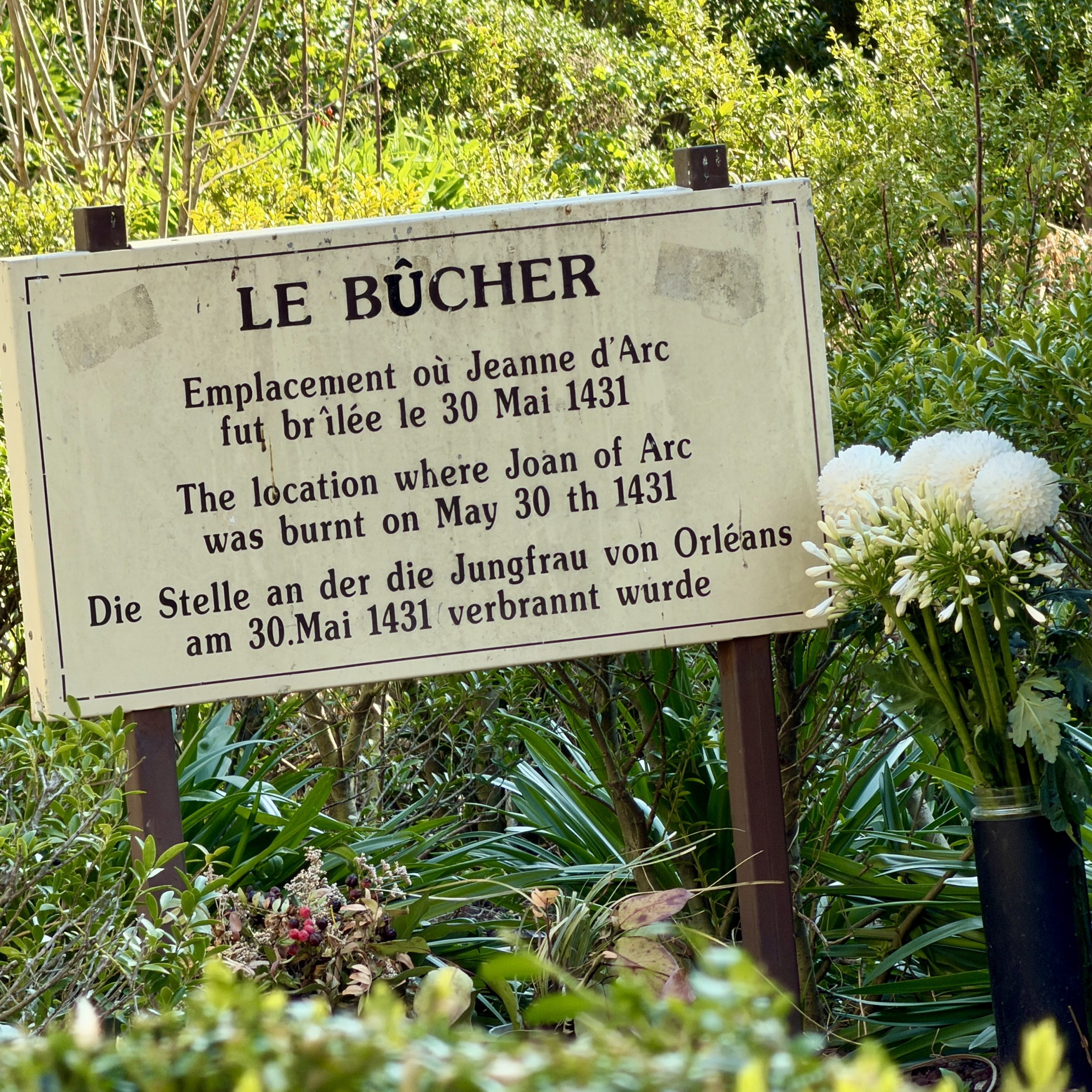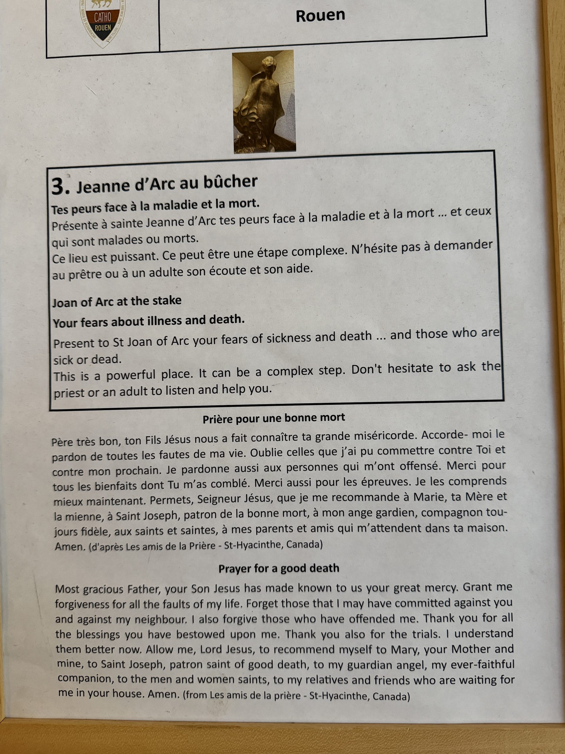 Near a back corner of the church, I found this statue of Joan at the stake, with places to leave candles and prayer intentions — specifically for a “good death.”