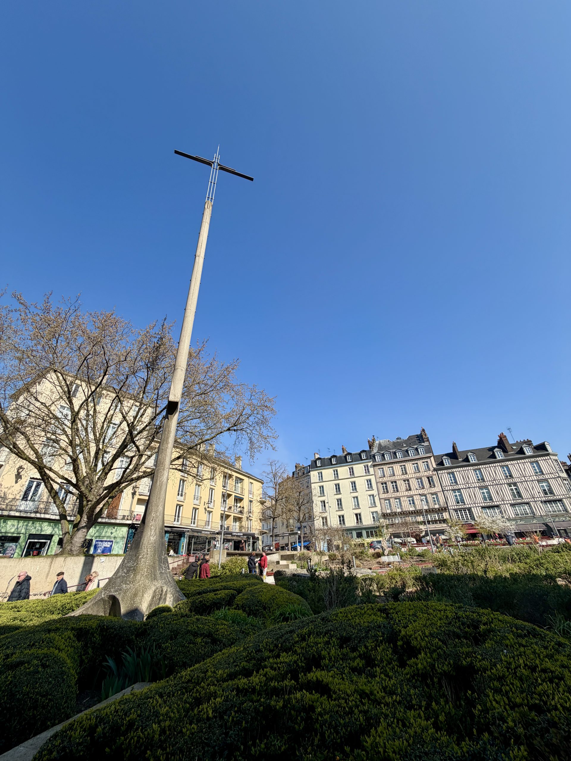 Adjoining the square is Church of St. Joan of Arc — a striking, modern building, resembling in many ways a rising flame, built on the site where St. Joan was executed in 1431 by being burned at the stake.