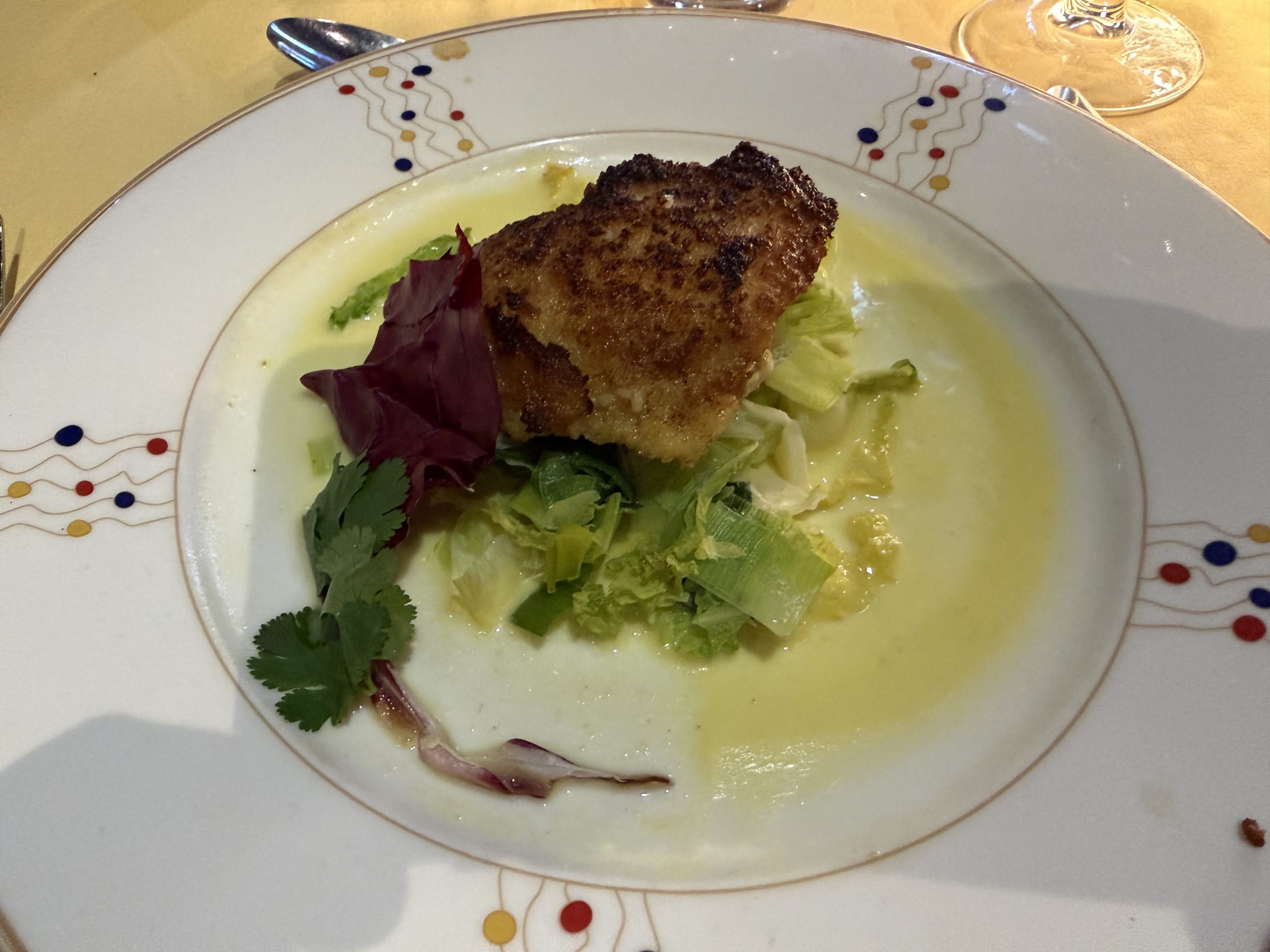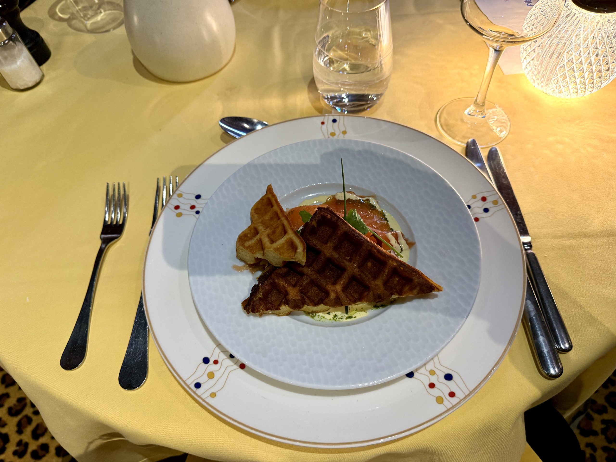 It was really a fantastic lunch. I can’t begin to do justice to this meal, but I can report that the first dish involved salmon and waffles (!) and the main course featured another kind of fish, and desert resembled some exotic sort of apple pastry, complete with dollops of whipped cream.