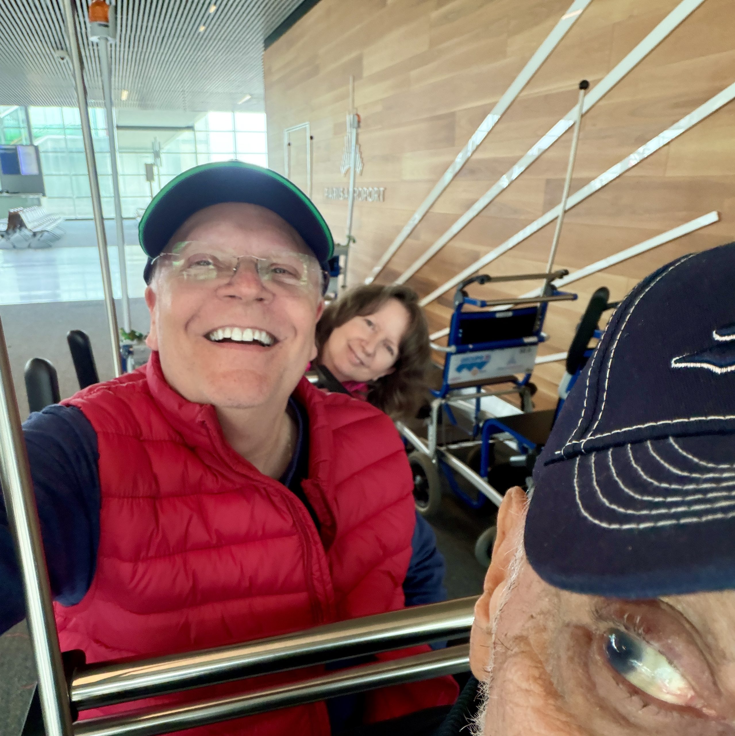 There was no announcement. Zero. There was just a sudden change in the sign by our gate. I got a text message from Deacon Kevin Meece, from another far-off corner of the airport, confirming it. He tried to explain how to get to the new gate — which evidently involved a lot of walking, an elevator trip, and a brief bus ride. Really?