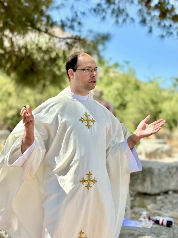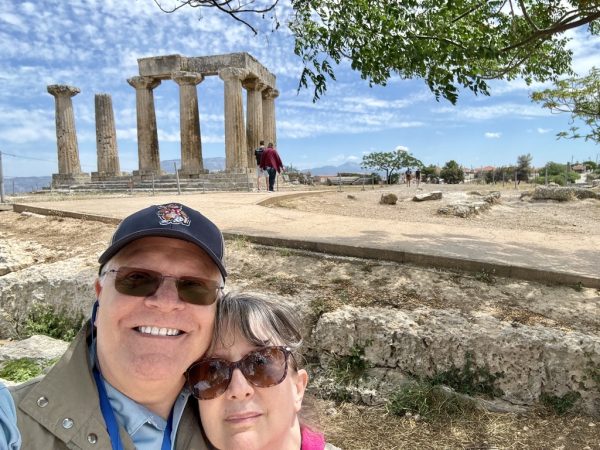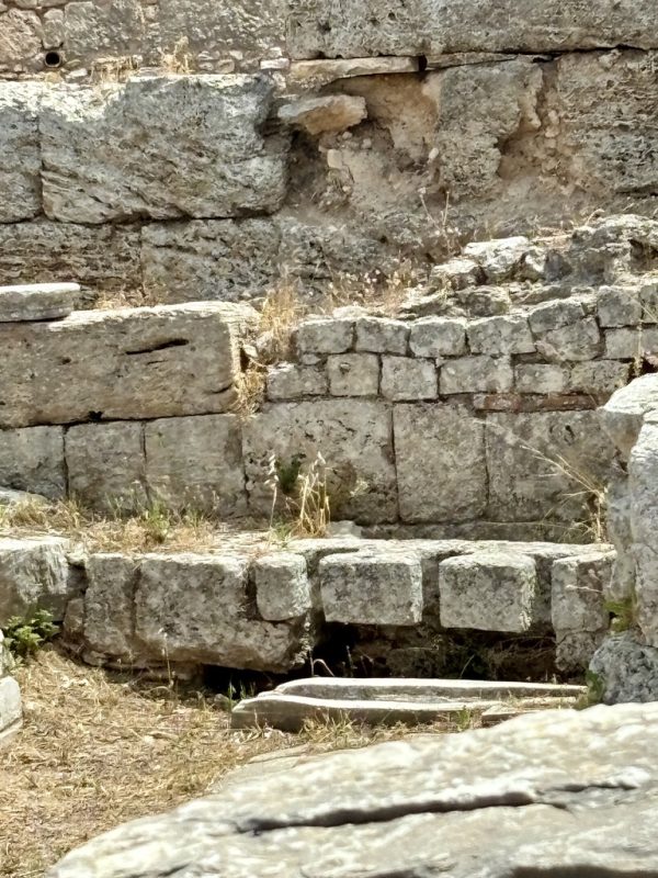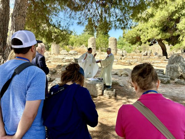 One of the challenges of Corinth turned out to be the outdoor Mass. Our guide, Sofia, found a shady place with some stones we could use as an altar, and some benches we converted into pews. But it was a blustery morning and there was a fair amount of improvisation involved.