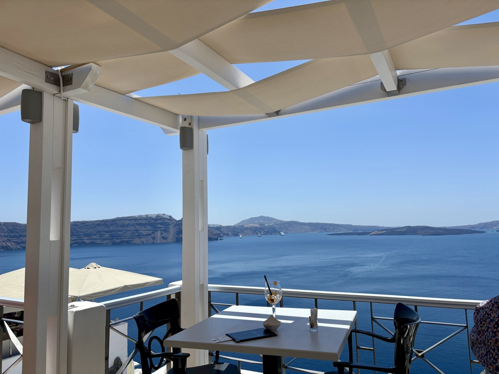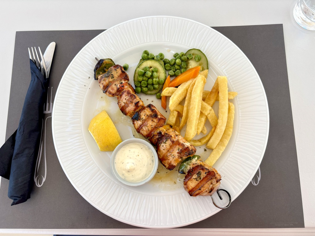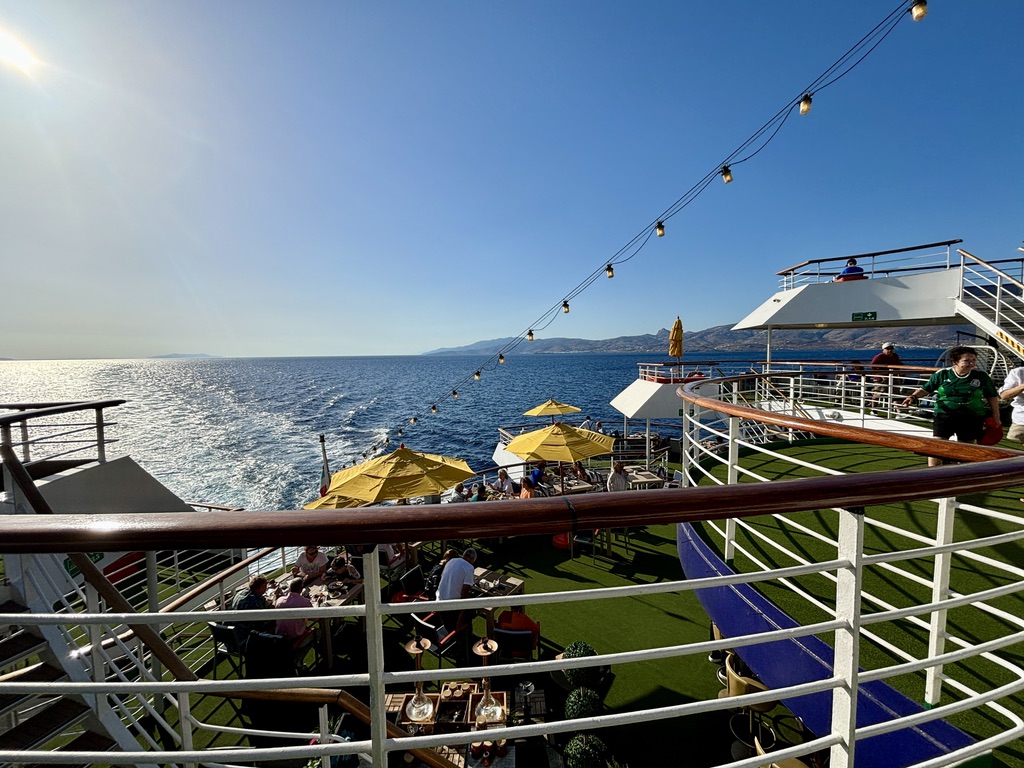 At the start of the cruise, we were issued tickets which entitled us to complimentary soda, juice or wine at any meal. My one quibble (and this is something that extended throughout Greece, wherever we went): almost nobody offers coffee after lunchtime. For that, you need to find a coffee house somewhere.