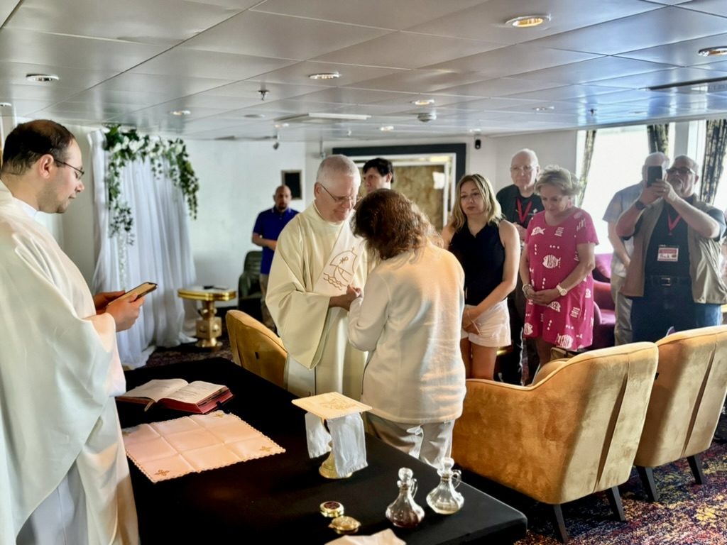 Late Friday, we had Mass in one of the lounges (a disco, actually), and Siobhain and I celebrated at sea our 38th wedding anniversary. Father Jeremy offered us a blessing.