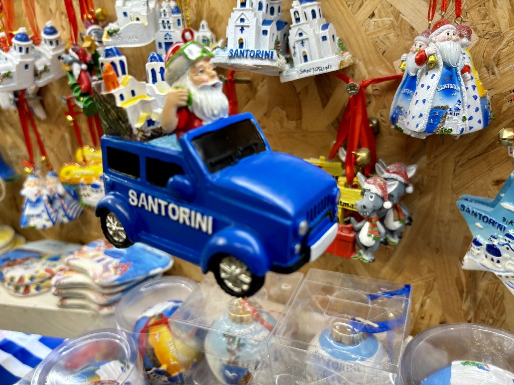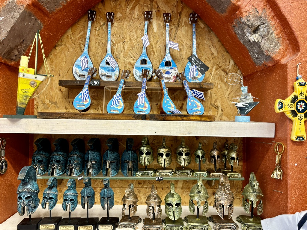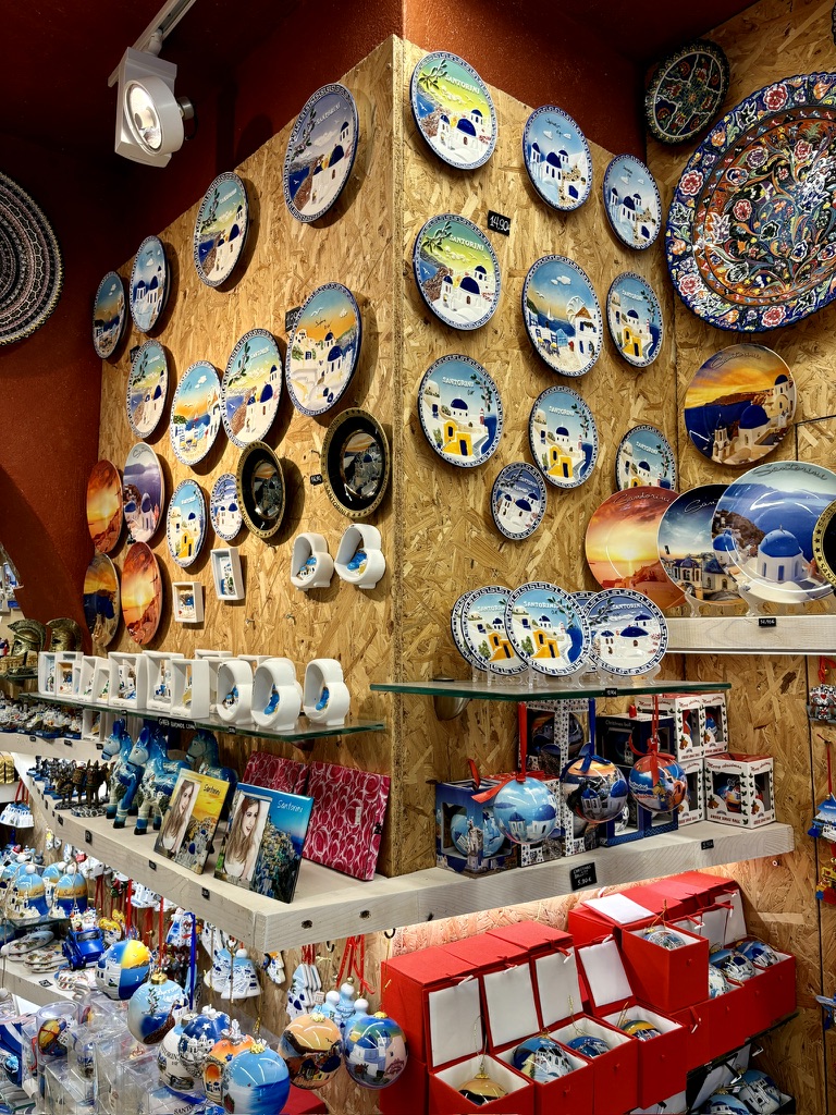 The souvenir shops sell all the usual stuff. If you love blue and white, this is the place for you.