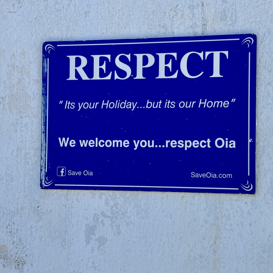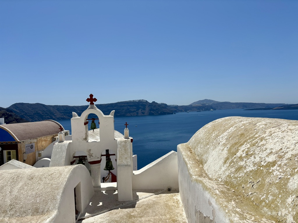 The ferry took us to a pier, where we boarded a bus for a roughly 40-minute ride to the heart of the island, the village of Oia. Once we got off the bus, we found ourselves confronting almost every single tourist in the world. (Or so it seemed.) Mobs of shoppers, walkers, browsers, you name it. Everywhere, people were dipping into stores, pausing to gawk, taking selfies, stopping to read menus, looking nervously for the nearest public restroom. (They are few, by the way, and you need a euro to pay for entry.) Along the way, we often passed porters, hoisting wheeled suitcases up the stone streets, leading guests from their taxis to boutique hotels overlooking the Aegean. Welcome to peak season in Santorini.