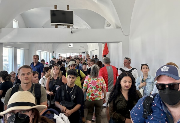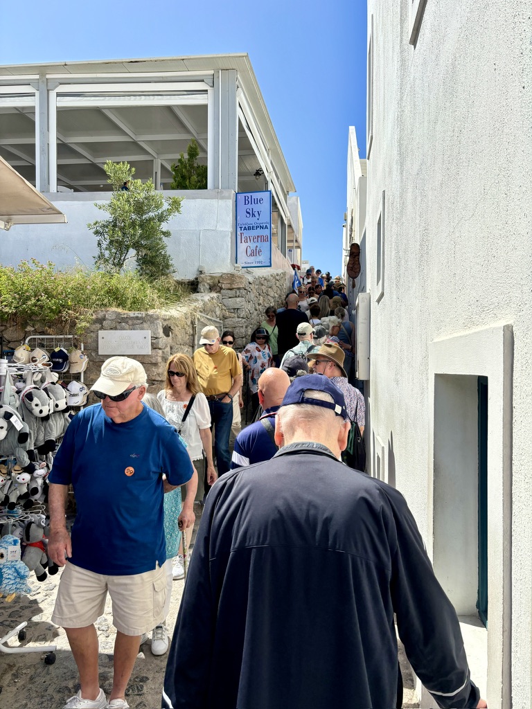 After a couple hours of window-shopping and seeing endless white walls and limitless blue skies and water, we headed back to the bus, and then to the ferry. We made a pitstop at the restrooms near the ferry. Again, crowds. Our guide, Kerri, led the way. You can’t see her in the image below, but she’s the one carrying the red flag.
