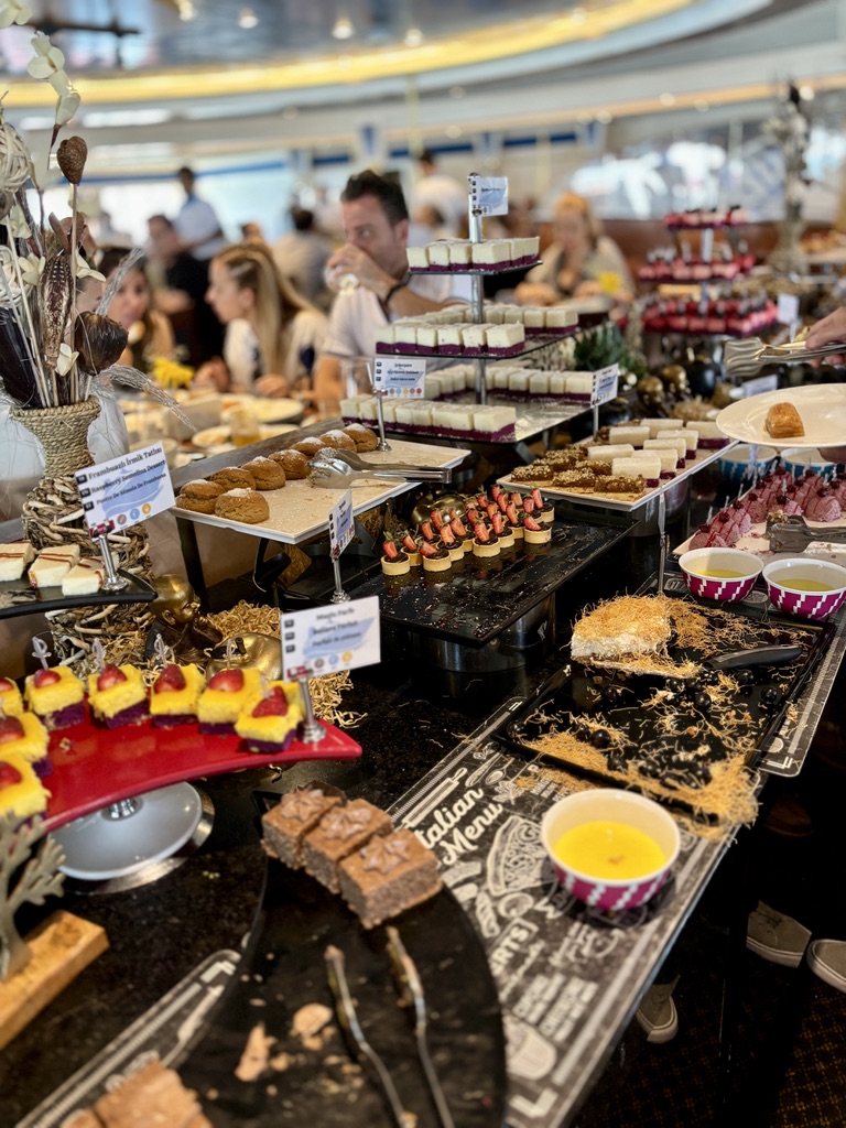 Dinners typically include a lengthy array of cheeses, lettuce, and various salad dressings, along with hot dishes that included a beef, chicken, and some form of fish. (Herring was the choice one night). Although the passengers come from all over the place, with a lot of Europeans, there are some dishes clearly geared toward American taste buds; pasta at dinner and pancakes for breakfast were typical. And then there are desserts! Every kind of baklava imaginable — which, in Greece, is put out at breakfast, too — plus tiramisu, cakes, assorted pastries, pudding and, yes, fruit.