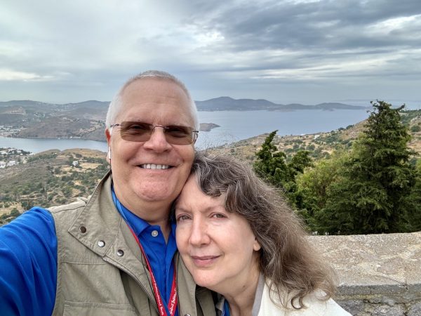 What a blessing all this has been. Here’s a shot of two happy pilgrkims from outside the monastery on Patmos.