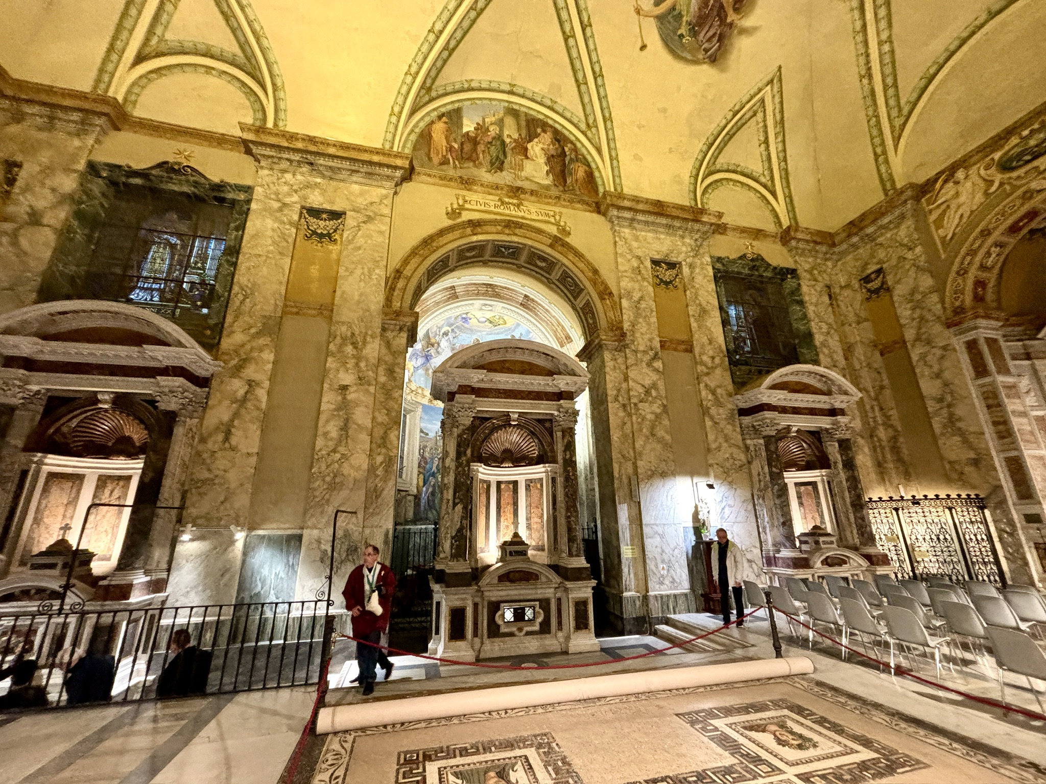 Much lively dialogue ensued (in Italian — without subtitles, unfortunately) involving our tour manager Alessandra and the security personnel. Eventually, we made it through and Alessandra directed Father Ferdi and two deacons, Mike Friske and Richard Hay, to the basilica sacristy. She then got us to our chapel.