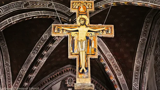 Our hotel is just about five minutes from the town. After a quick ride, we disembarked in a bus parking lot and took an escalator up a hill to meet our guide. We walked a short distance to the Basilica of St. Clare, to see the iconic San Damiano cross and pray before the remains of Clare herself.