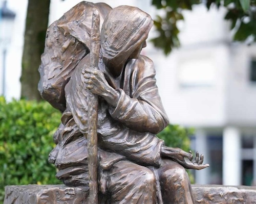 Schmalz’s bronze statue — located near the Showers for the Poor and the Mother of Mercy Clinic in the colonnade of St. Peter’s Square — depicts a man seated on a bench “who appears to be a homeless person” carrying only two possessions: a full backpack on his shoulder and a stick in one hand.