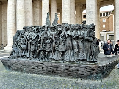 The same Scripture verse also inspired Schmalz’s Angels Unawares sculpture — also located within St. Peter’s Square — which depicts 140 migrants of different ethnicities and nationalities standing on a boat.